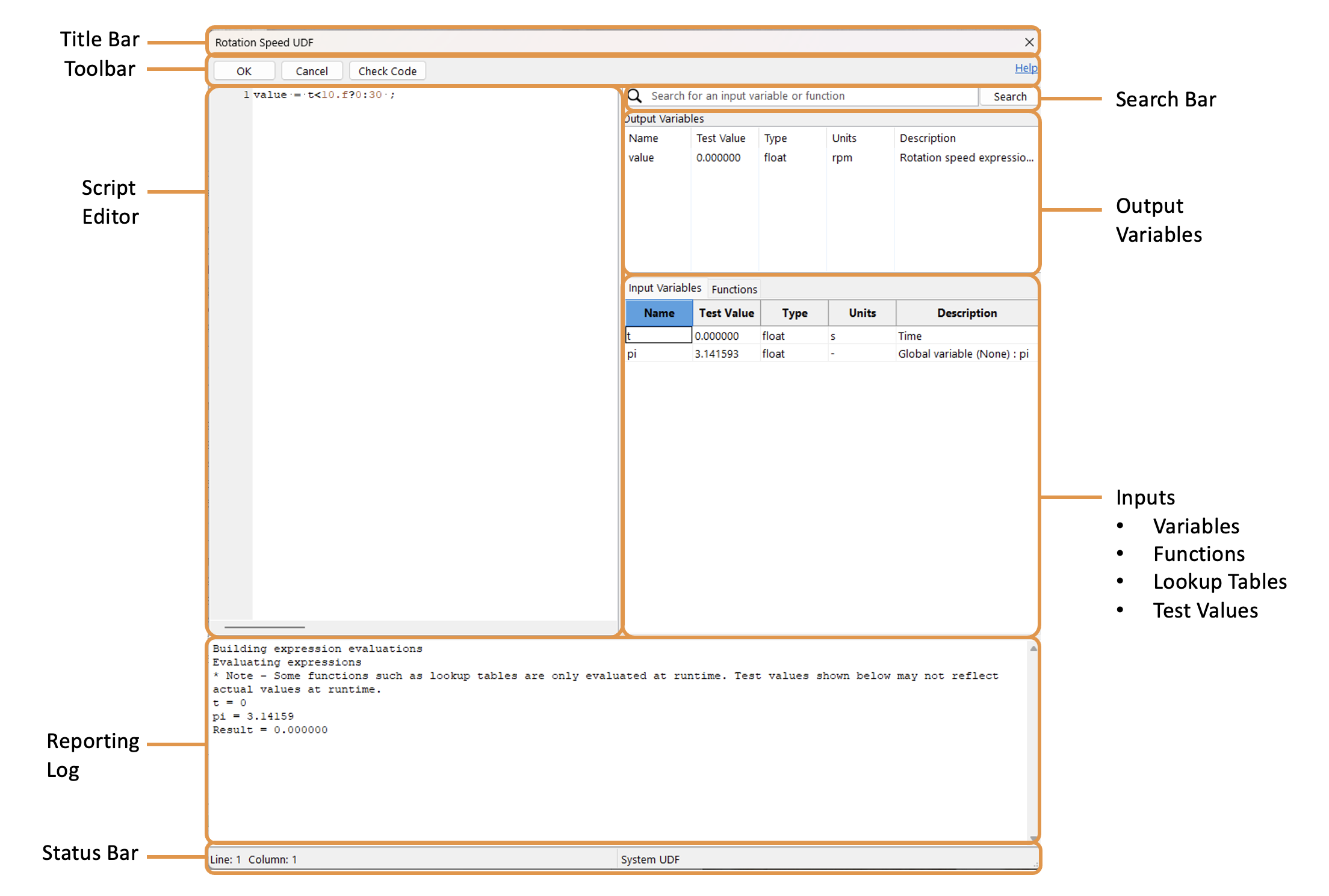 Toolbar: These action buttons are used to close the editor and perform a syntax/output check on the UDF. OK saves the code script and closes the form. Cancel closes the form without saving the code script. Check Code performs a syntax check on the UDF script and computes the output based on the test values provided. The result of this syntax check, as well as the output values, are viewed in the Reporting Log.