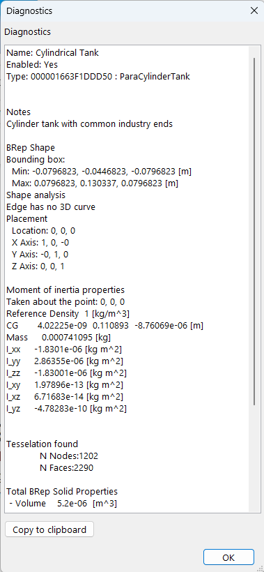 The Diagnostics window reports the position, orientation, and moments of inertia associated with child geometry. This information is useful for characterizing the instantaneous state orientation and bounding box of a geometry. For imported geometry, it records the original location of a file. Moments of inertia are also calculated, as may be necessary when modeling driven motion.