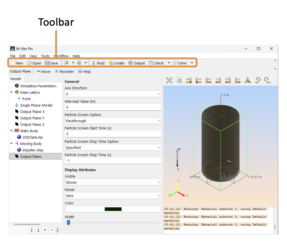 The static toolbar is used, among other things, to define the fluid model, add physics to the system, tailor the simulation output, and execute the simulation. The toolbar is located just below the menu and provides shortcuts to menu commands.