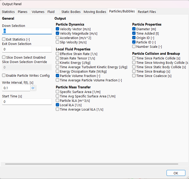 Output bubbles/particles controls how particle and bubble data are written, including output down-selection, exit tracking, and customized write intervals for efficient, targeted post-processing.
