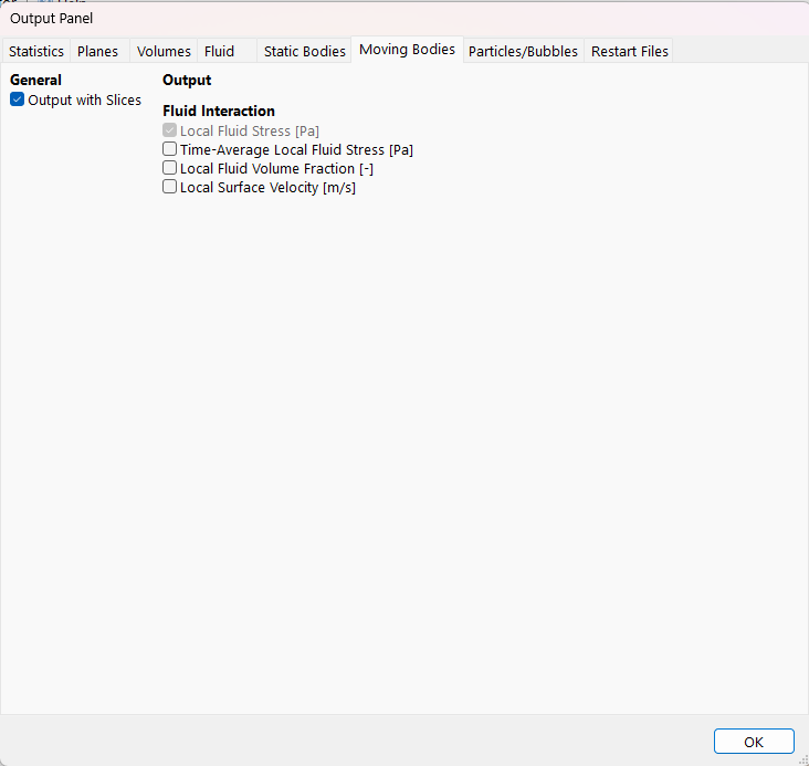 Output moving bodies controls the export of time-averaged stress and volume fraction data for moving bodies to support detailed analysis of their fluid–structure interactions.